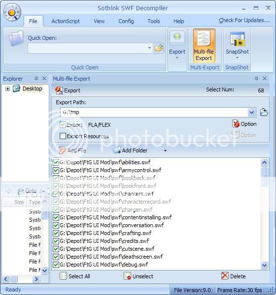 If you're using Sothink's tool, then here's an example of how you would quickly retrieve the ActionScript, if you've converted the GFX into SWFs as mentioned above. Do a multi-file export with all of the SWF files (merged to whichever patch version you wish). Screen shot