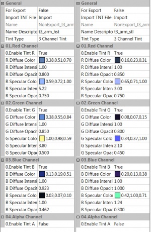You’ll see in the Object Inspector a whole series of colours, labelled diffuse and specular for the red, green and blue channels. Diffuse is the actual base colour, and specular is the highlights. The channels it is referring to is of the tint map. This has 4 channels (RGB plus Alpha), each of which is a greyscale image that is used to define the area its related tint colour is applied. Refer to the other relevant wiki tint and texture topics for more info.