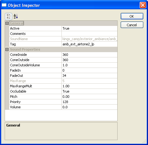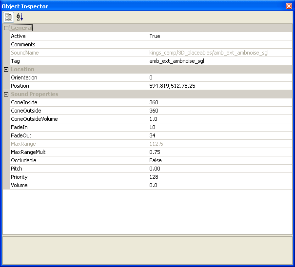 The object inspector is a facility offered by the DA designer toolset with which to perform several processes to the sounds we have applied to any given level. We have the ability to modify the audio events that we have created as well as modify other parameters such as the active/inactive status of an emitter, adjust the position of an object, change the 3D cone of an emitter, as well as adjust the max range of the radius of an emitter. These modifiers are also supported by the ability to adjust the occludability, pitch, priority and volume of any given object. These functions will be explained in two ways: 1. how the object inspector allows modification to an audio volume and: 2. how the object inspector allows modification to an emitter.