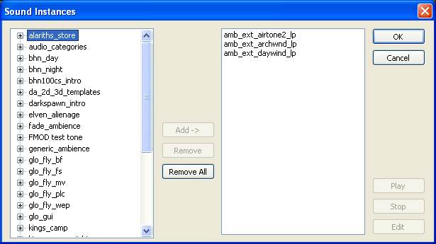 Any sound that you create events for and build to the .fev/.fsb files is available for use in the area editor. The area editor will see these sounds and make them available when the editor is opened or when the “Refresh F5” option is selected from the menu. This way you can keep the editor open, go back to FMOD, edit, rebuild and then see your changes in the area editor.
