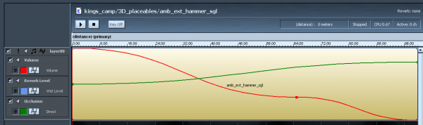 − | The object inspector is a facility offered by the DA designer toolset with which to perform several processes to the sounds we have applied to any given level. We have the ability to modify the audio events that we have created as well as modify other parameters such as the active/inactive status of an emitter, adjust the position of an object, change the 3D cone of an emitter, as well as adjust the max range of the radius of an emitter. These modifiers are also supported by the ability to adjust the occludability, pitch, priority and volume of any given object. These functions will be | + | The object inspector is a facility offered by the DA designer toolset with which to perform several processes to the sounds we have applied to any given level. We have the ability to modify the audio events that we have created as well as modify other parameters such as the active/inactive status of an emitter, adjust the position of an object, change the 3D cone of an emitter, as well as adjust the max range of the radius of an emitter. These modifiers are also supported by the ability to adjust the occludability, pitch, priority and volume of any given object. These functions will be explained in two ways: 1. how the object inspector allows modification to an audio volume and: 2. how the object inspector allows modification to an emitter. |