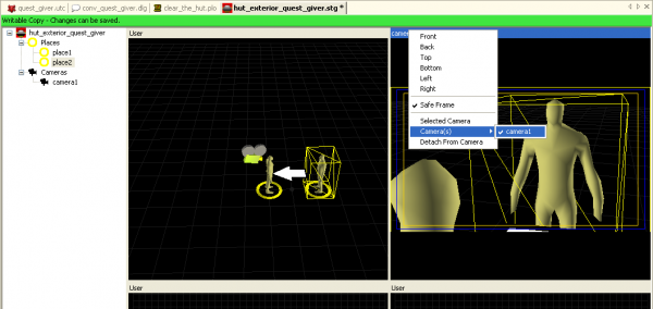 The next step is for the designer to assign a specific stage tag (of instances) for dialog trees. Note that a single dialog file usually has more than one tree, and each one might be assigned a different stage. When placing a stage, the toolset associates a stage camera for each line in the tree. The toolset will assign cameras if adding new lines into a tree which already has a stage associated with it. This way the user can preview a camera shot of each line.
