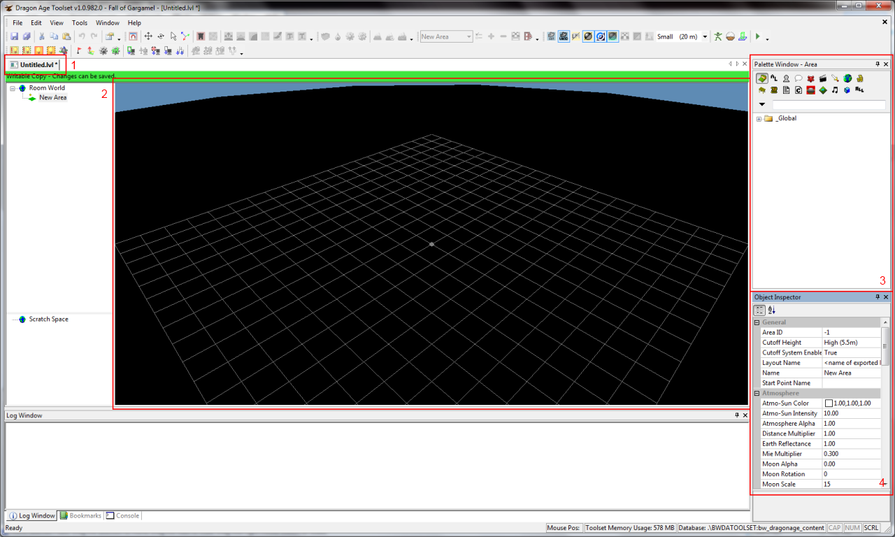 - Area #1 in the upper left hand corner of the image represents the current name of the item being edited. We can see our level is currently named "Untitled.lvl"; we can also see at a glance that the dirty indicator is set for this file. The dirty indicator is the asterisk next to the name of the item.