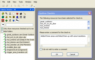 You can view a summary of the changes you've made to a checked out object by comparing it with the version in the database with the "Diff to Last Checked In" command, available by right-clicking the object in the palette window. The editing window will show the source text of the two version side by side, with added lines highlighted in green, changed lines highlighted in gray, and deleted lines highlighted in red. If you're satisfied with your changes you can apply them to the copy storied in the database by right-clicking on the object in the palette window and selecting "check in", or if you'd prefer to go back to the old version that's stored in the database select "undo check out".
