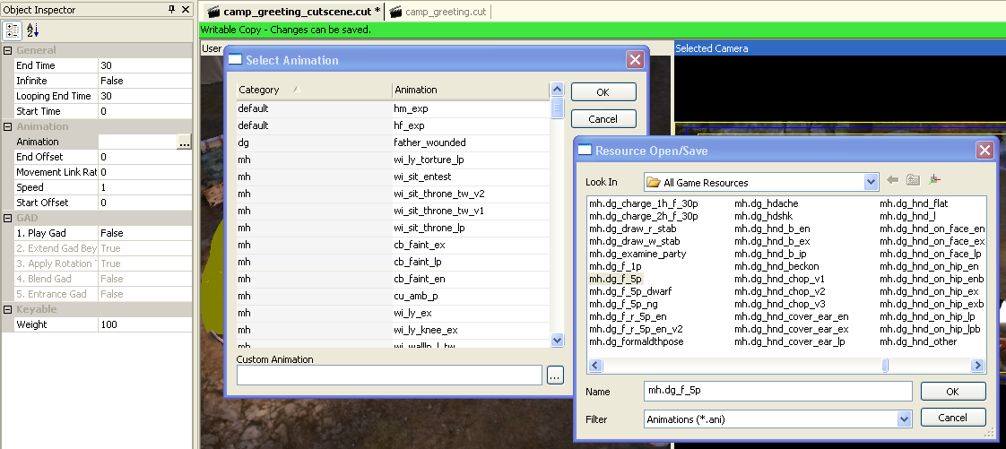 В нашем случае, анимация "mh.dg_f_5p" ("male human dialog forward five paces" - мужской человек диалог вперед 5 шагов), которая нам нужна, не отображается в стандартном перечне анимаций, доступном в сортировщике анимаций. Вам понадобится нажать кнопку «Next» в поле «Custom Animation» и найти ее в полном перечне всех анимационных ресурсов.