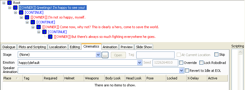 На следующих скриншотах показан наш намеченный разговор. Все, что нам необходимо определить для него – это текст диалога, и опционально, настройки эмоций для RoboBrad для генерации выражений лица. Как говорилось выше, мы генерируем синтезируемый заполнитель голоса, и генерируем FaceFX на его основе. Когда мы запишем реальный голос позднее, мы просто сможем обновить этот разговор с уже новым голосом, и исполнение катсцены изменится в соответствии с этим.