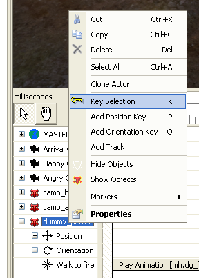 Движения обрабатываются, задавая позицию и ориентацию объекта в определенные моменты времени, названные ключевыми кадрами, и затем – интерполяция промежуточных позиций и ориентаций. Чтобы задать ключевой кадр, кликните правой кнопкой мыши на актерской записи в шкале хронологии и выберите «key position» (позиция ключа). Это установит ключ для конкретной позиции и ориентации в конкретный момент времени на шкале хронологии. Вы можете, если хотите, установить ключ позиции и ориентации самостоятельно. Так как эта операций очень распространена, для нее есть очень удобный ярлык: «k» - вставляет ключ для текущей позиции выбранного объекта и ориентации, «p» - вставляет ключ для его позиции, «o» - вставляет ключ для его ориентации. Альтернатива – выберите объект и нажмите на команду «key» на панели инструментов:
