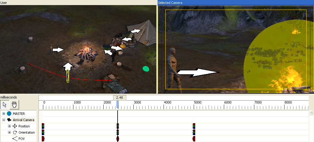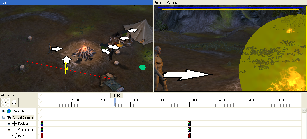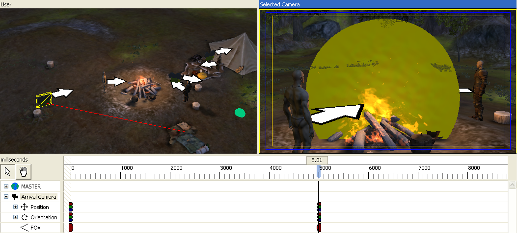 Сейчас сцена имеет некоторые динамические действия, которые мы и хотели использовать, показывая актера шагающим в направлении костра и остановившимся возле него. Но это все еще скучное внедрение, и мы можем сделать лучше. Вместо статического кадра, мы можем установить камеру так, чтобы она панорамировала через всю сцену, следя за прибытием актера.