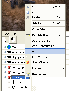 Каждый объект катсцены имеет предопределенный трек «Position» (позиция) с тремя под-треками для его (объекта) X, Y, Z координат. Большинство объектов также имеют предопределенный трек «Orientation» (ориентация), с тремя подтеками для pitch (тонгаж, поворот вокруг оси X ), yaw (рыскание, поворот вокруг оси Y) и roll (крен – поворот вокруг оси Z ). Эти треки могут быть использованы, чтобы заставить объект перемещаться в пределах зоны катсцены.