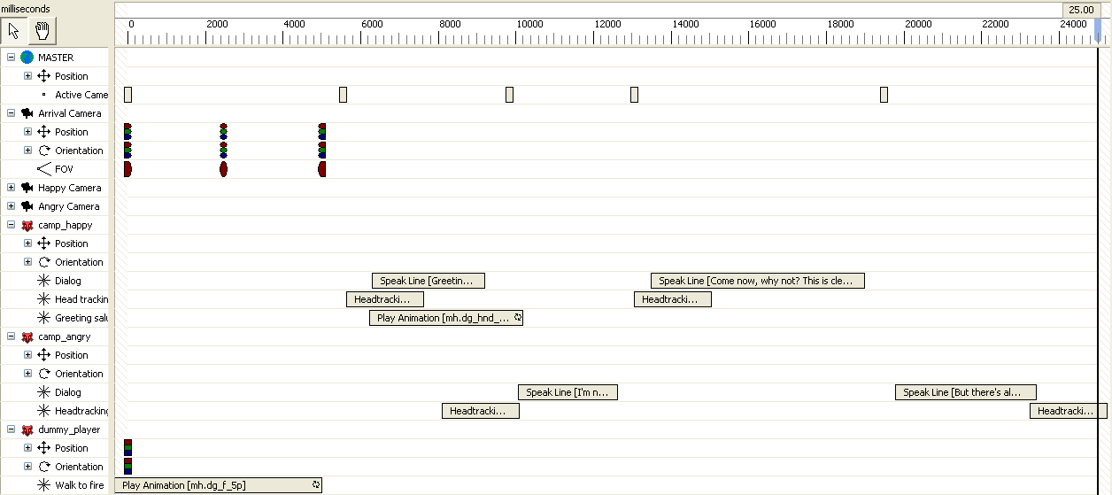 Для следующей строки разговора NPC camp_happy, мы сделаем изменение «headtraking» (направление взгляда/головы) видимым во время показа его (NPC) крупным планом так, чтобы игрок увидел, как внимание актера camp_happy переключается на NPC camp_angry (сердитого). Отметьте себе, что мы можем повторно использовать существующие треки «Dialogue» и «Headtraking» для этого актера. Нам не нужно создавать новый трек для каждого одиночного действия, которое выполняет актер. До тех пор, пока продолжительность действий на трек не перекрываются, они могут мирно сосуществовать.