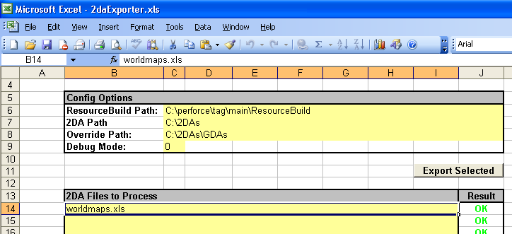 The worldmap 2DA Excel file shown ready for export in the 2daExporter.xls wrapper.