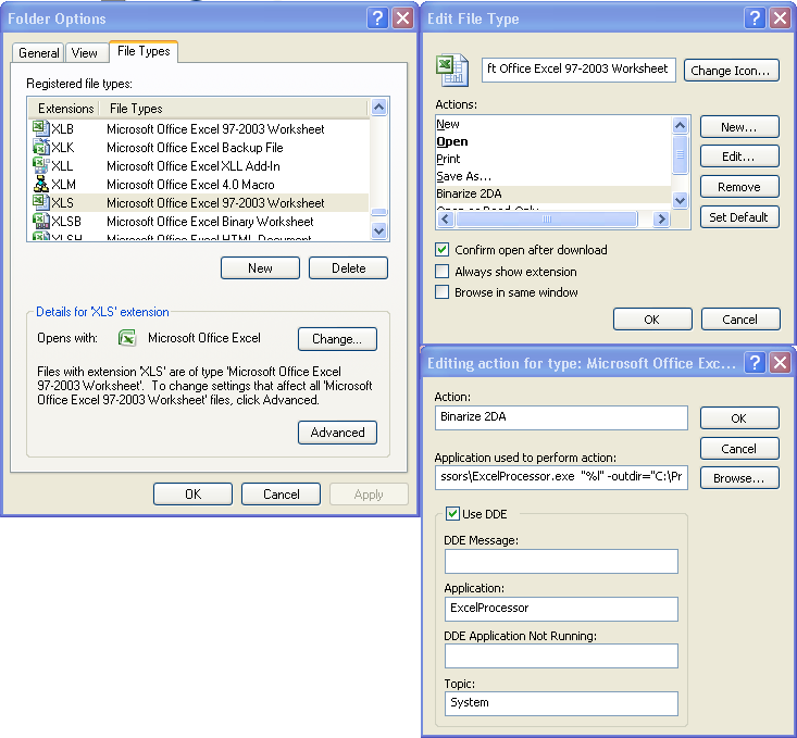An example screenshot showing how to add the "binarize 2DA" option to the right-click context menu of XLS files in Windows XP