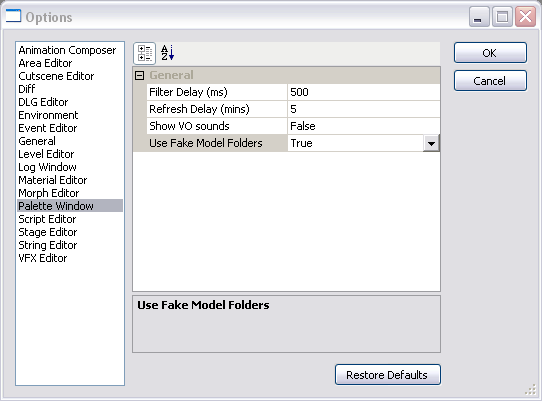 Unlike the database resource palette, the model palette doesn't have a heirarchy of folders and subfolders. Since there are usually a vast number of models available this can make the palette cluttered and difficult to work with. To make it more manageable you should set the toolset's configuration to "fake" a folder structure. The toolset will divide models up based on their names, using underscores as dividers; for example the models dwe_face and dwe_orzent would both be placed inside a "dwe" folder. The option for setting this can be found under the palette options menu and is in fact the default setting.
